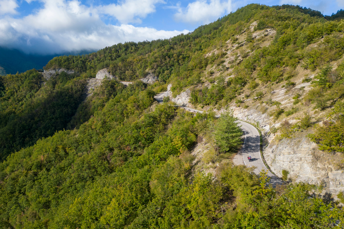 The day begins with a spiritual and natural touch: we ride to the enchanting Hermitage of Camaldoli, nestled deep within the Casentino Forests. Founded in 1012, this sacred site radiates peace and beauty. We continue on a short, easy unpaved stretch to Passo dei Fangacci, surrounded by towering silver fir trees. Then we descend into Badia Prataglia, one of the most authentic mountain villages in Tuscany. Next comes the panoramic Passo dei Mandrioli, offering sweeping views over the Savio Valley, followed by a thrilling final series of curves that lead us to the majestic Passo di Viamaggio. From here, the landscape opens to red gullies and the Tiber Valley, the natural border between Tuscany and Umbria. Our journey concludes in Caprile, a quiet village surrounded by greenery, where the “blue line of the sea” can be seen in the distance on clear days.